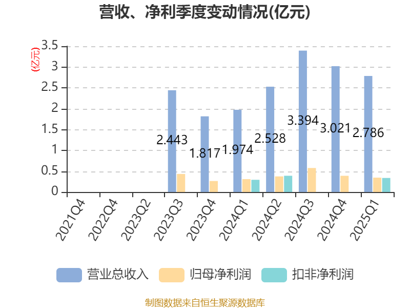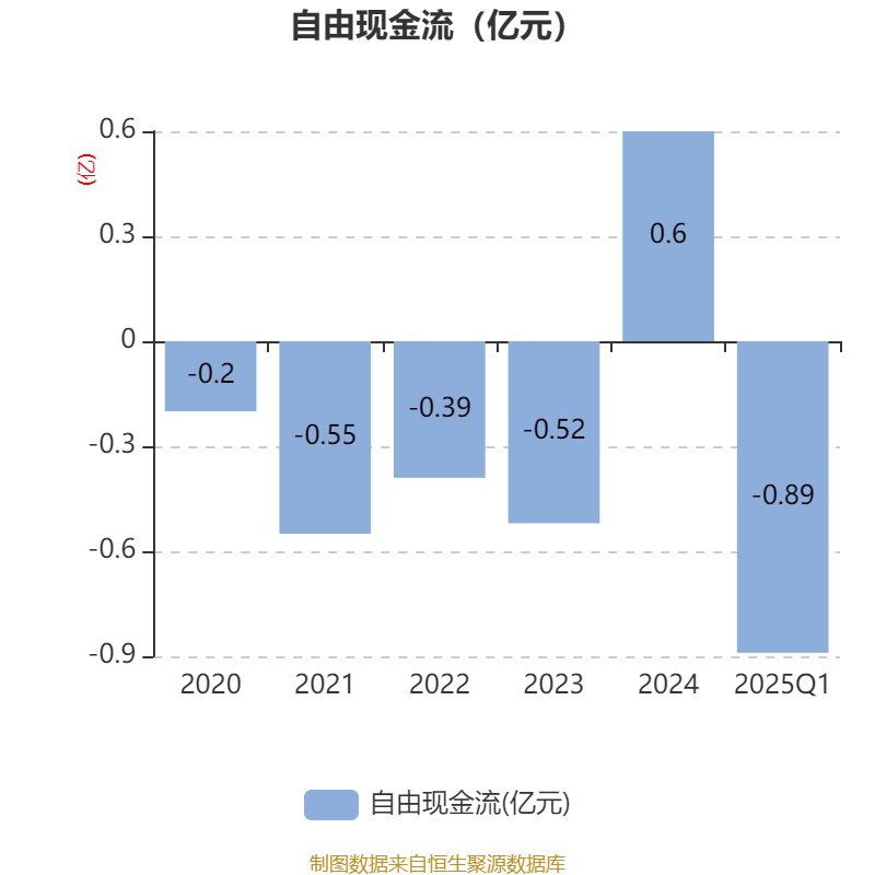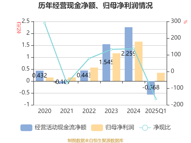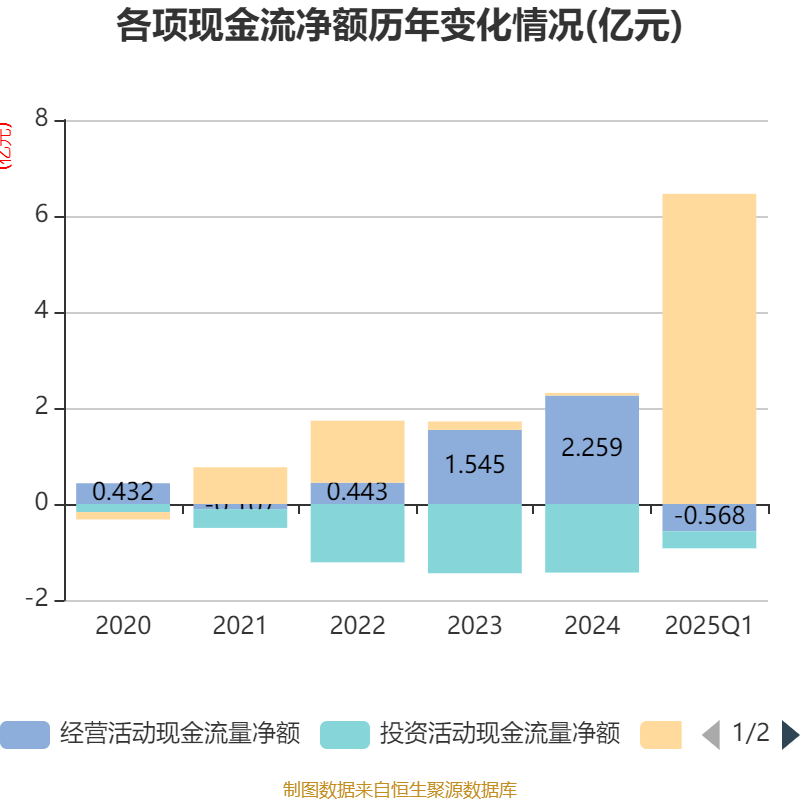 截至2025年一季度末,公司经营活动现金流净额为-5682.76万元,同比减少4053.13万元;筹资活动现金流净额6.46亿元,同比增加5.95亿元;投资活动现金流净额-3552.49万元,上年同期为-3670.1万元。